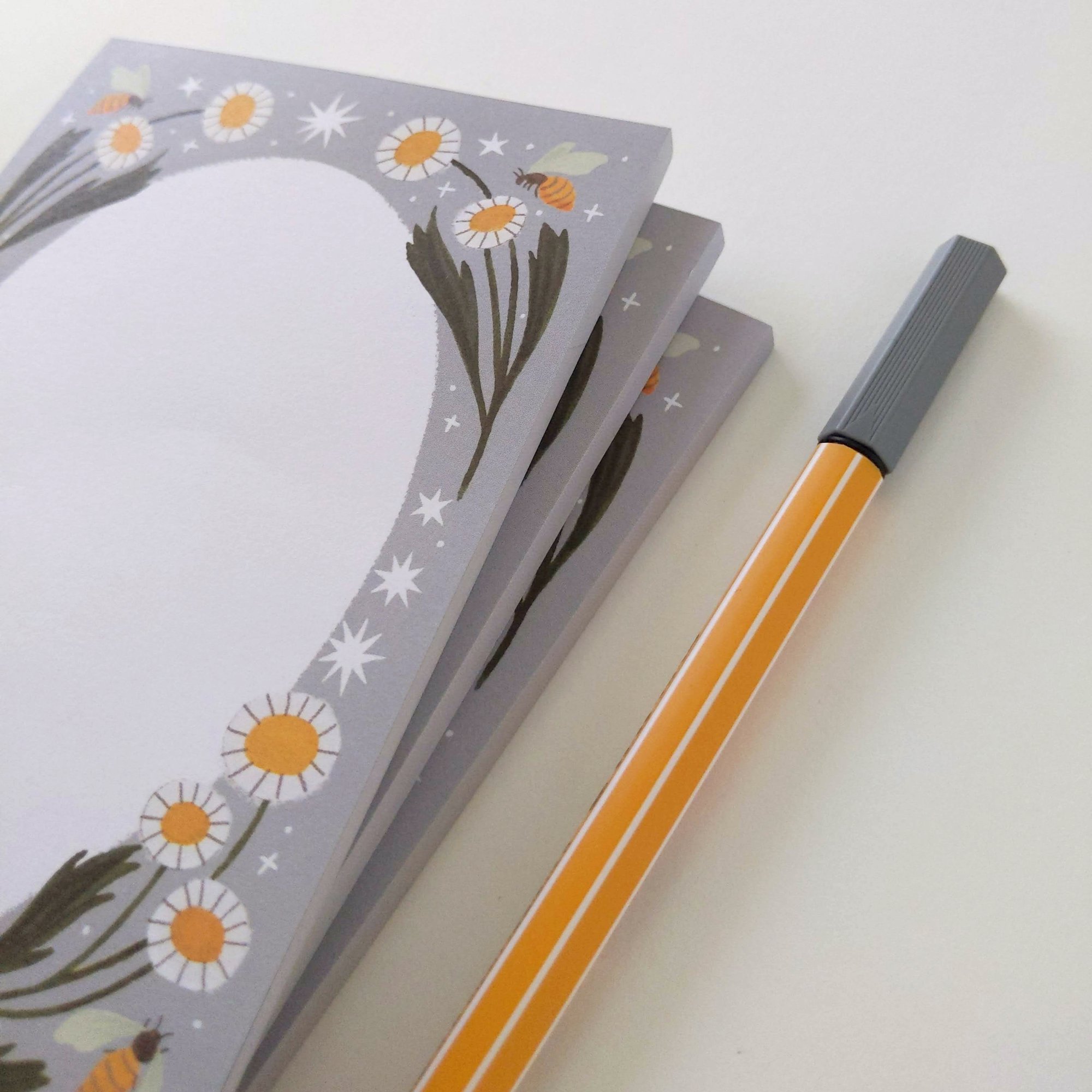 ◆ Illustrated with a hand painted whimsical decorative border of simple daisy flowers, bees and stars on a gray background