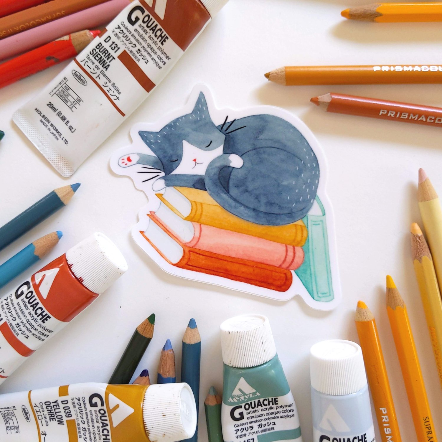 ◆ This sticker is made from my original hand painted illustrations and features sleepy cat on a stack of books. Sure to be a hit with readers, cat lovers, and anyone who likes to slow down and be cozy!