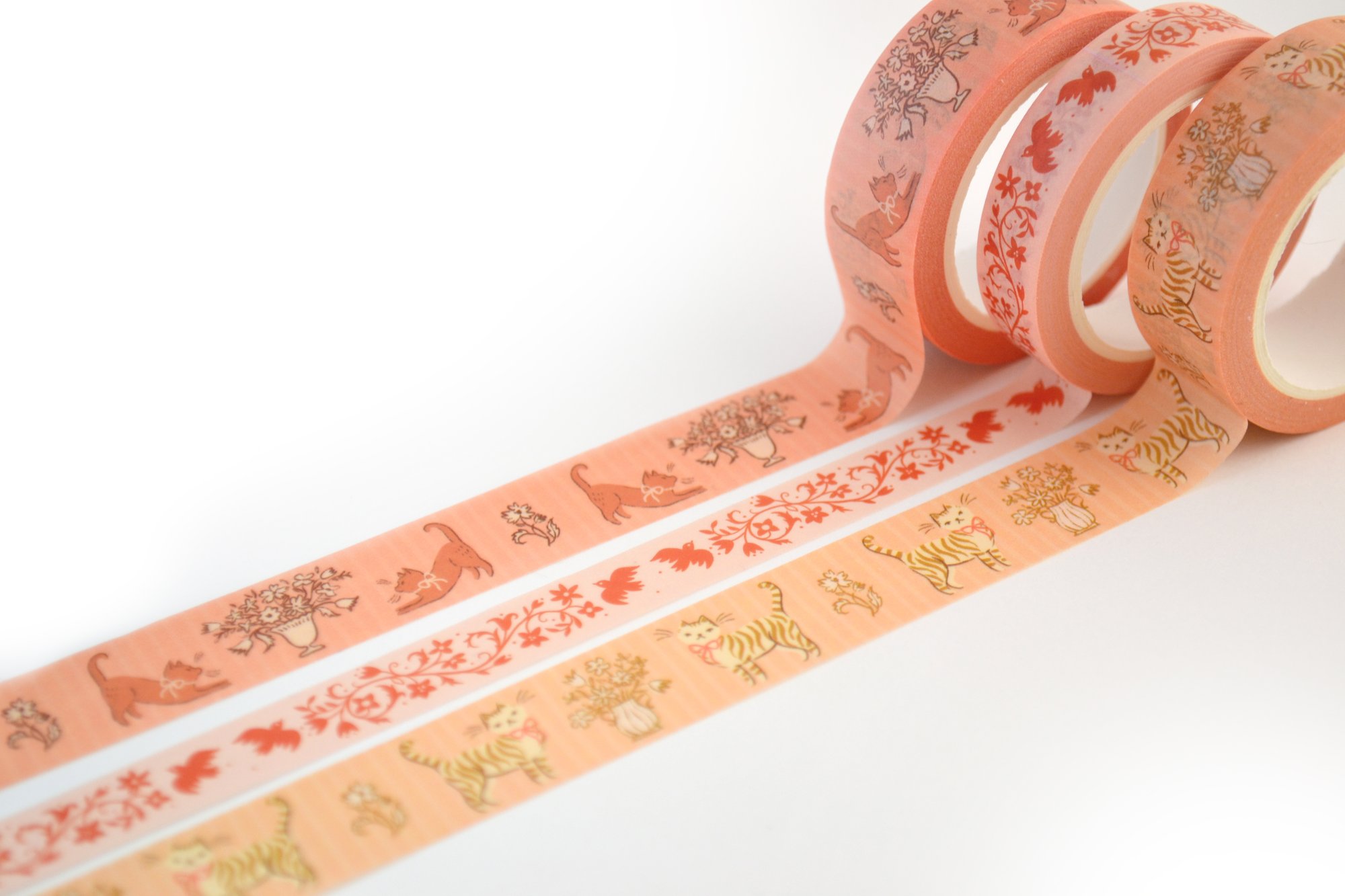 This charming washi tape is made from my original illustrations and it has a repeat design of yellow tabby cats with bows, flanking a vase of flowers.
