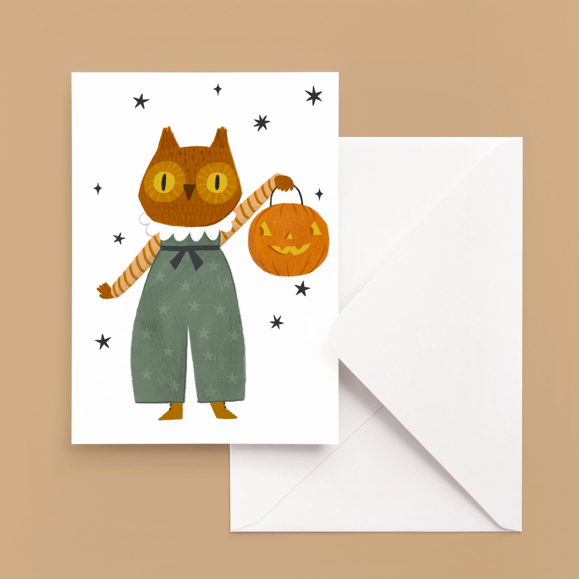 ◆ Share Autumnal greetings and brighten someone's day with this greeting card featuring my illustration of a cute Halloween owl ready for trick-or-treating