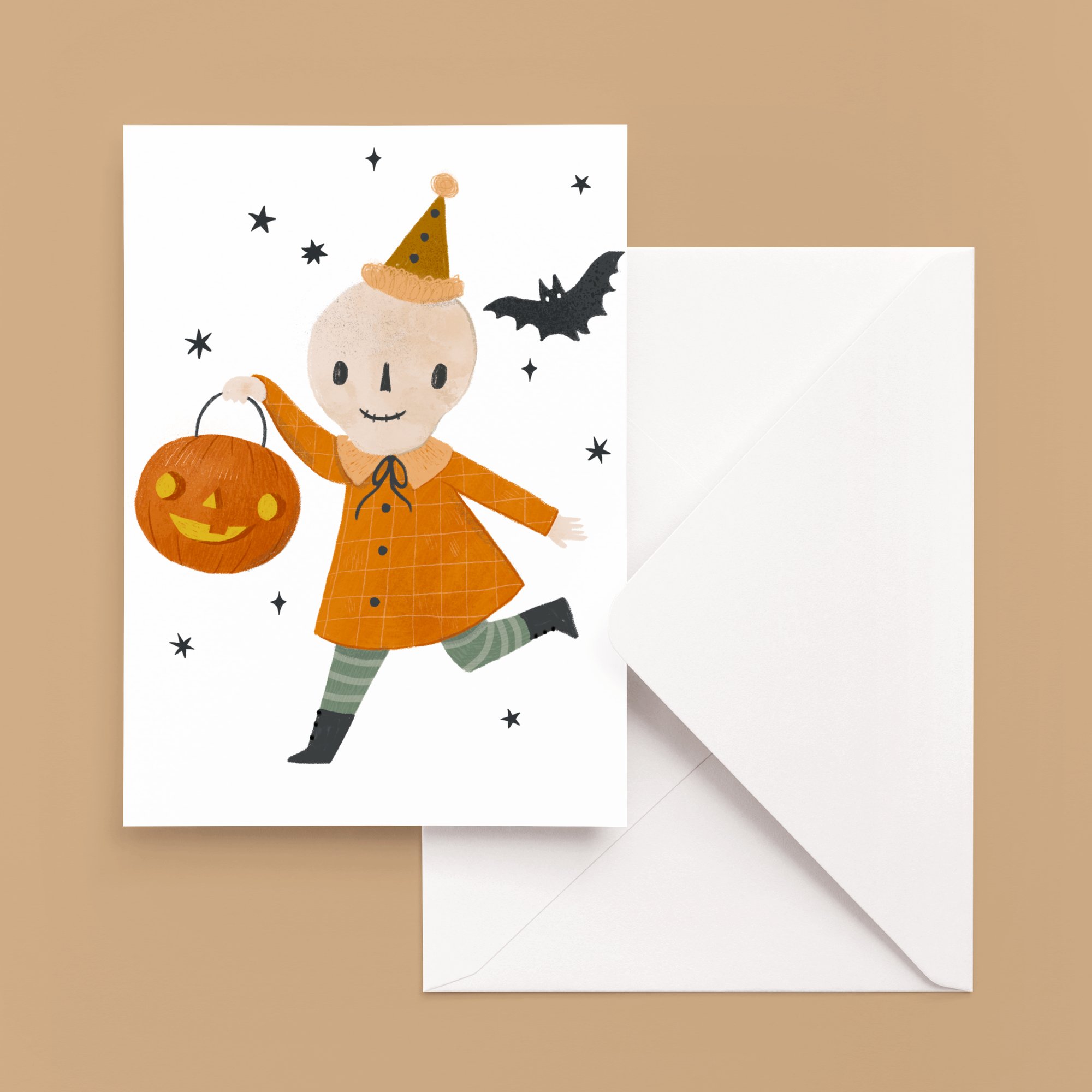 ◆ Share Autumnal greetings and brighten someone's day with this greeting card featuring my illustration of a cute Halloween skeleton ready for trick-or-treating