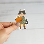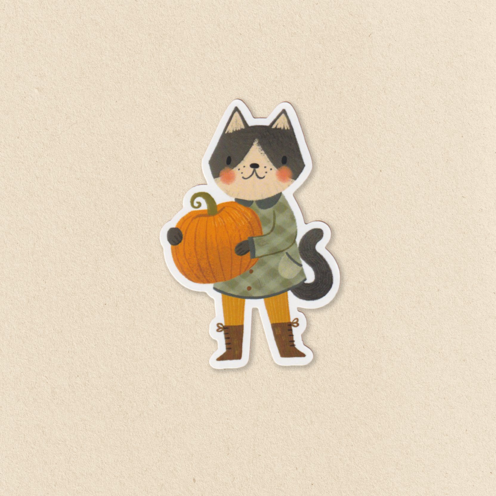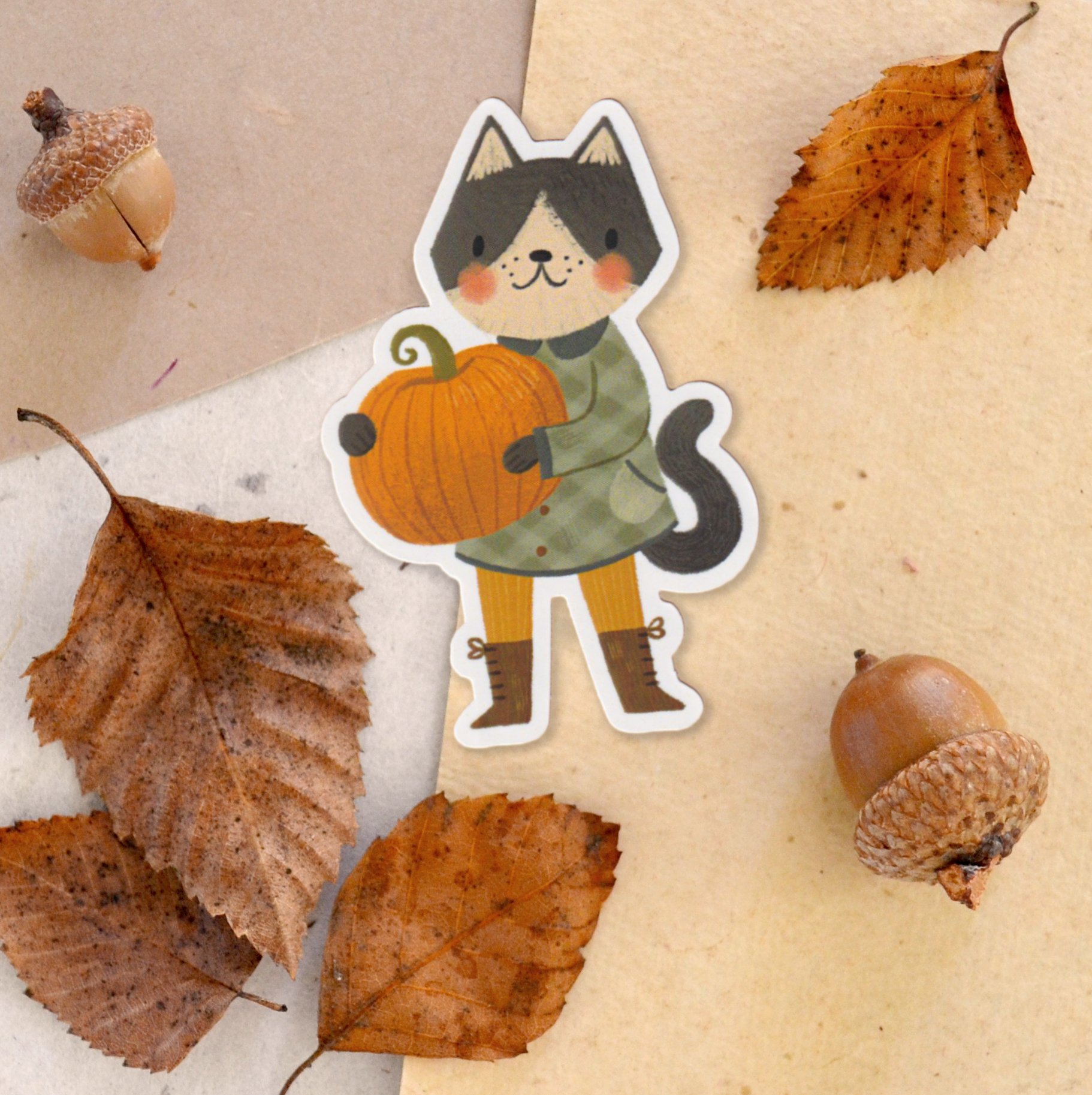◆ One sticker made from my original autumnal illustration of a cute cat holding a pumpkin
