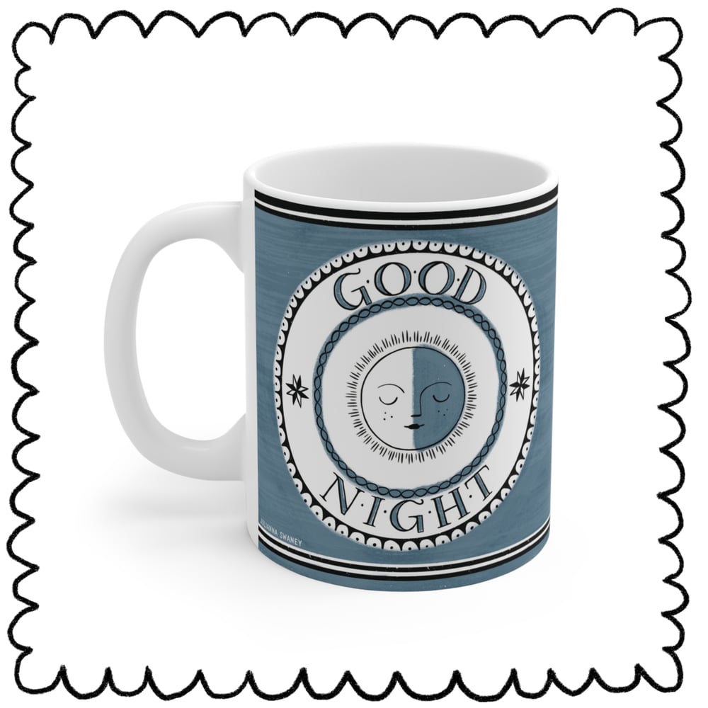 Enjoy a cozy cup of cocoa before bed in this Good Night mug decorated with a sleepy moon. This design is inspired by my love of antique English ceramics and features my own illustrations and hand lettering details.