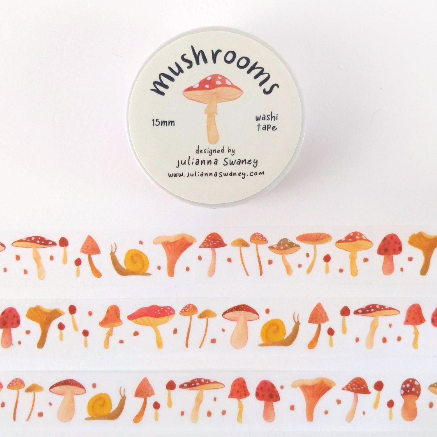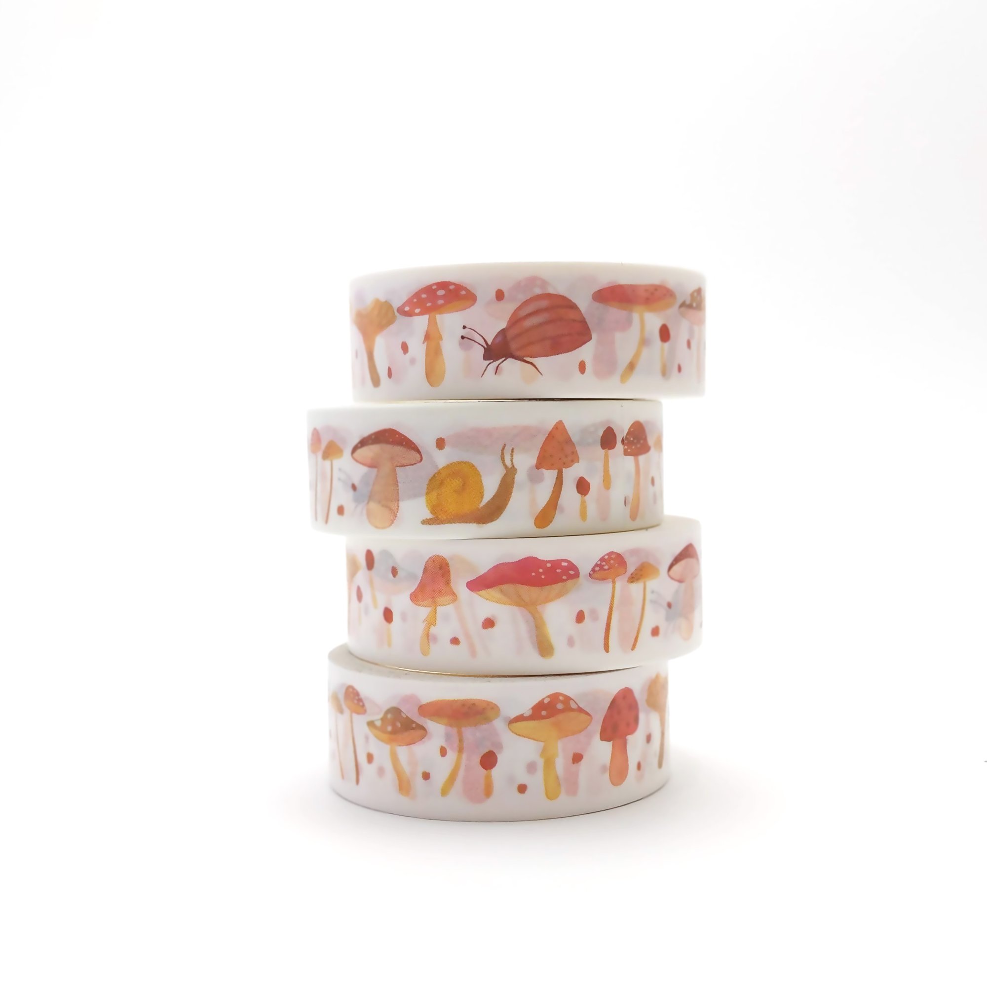 ◆ This cute washi tape is made from my original hand painted designs. It features a parade of pretty toadstools in shades of pink and yellow, with a few little snails and insects mixed in.