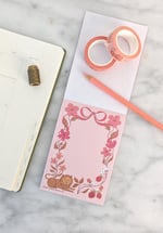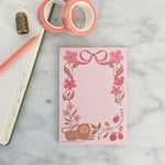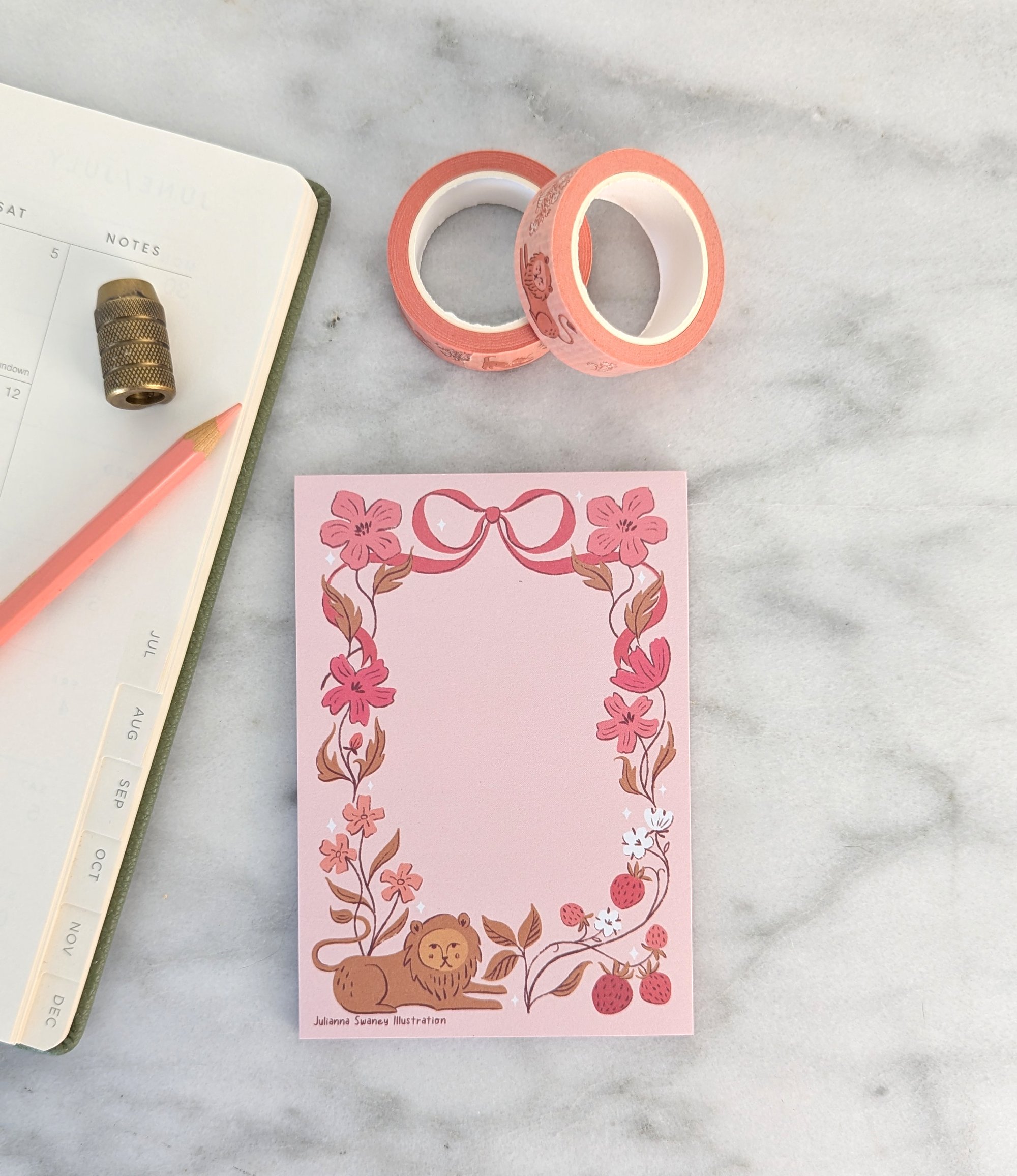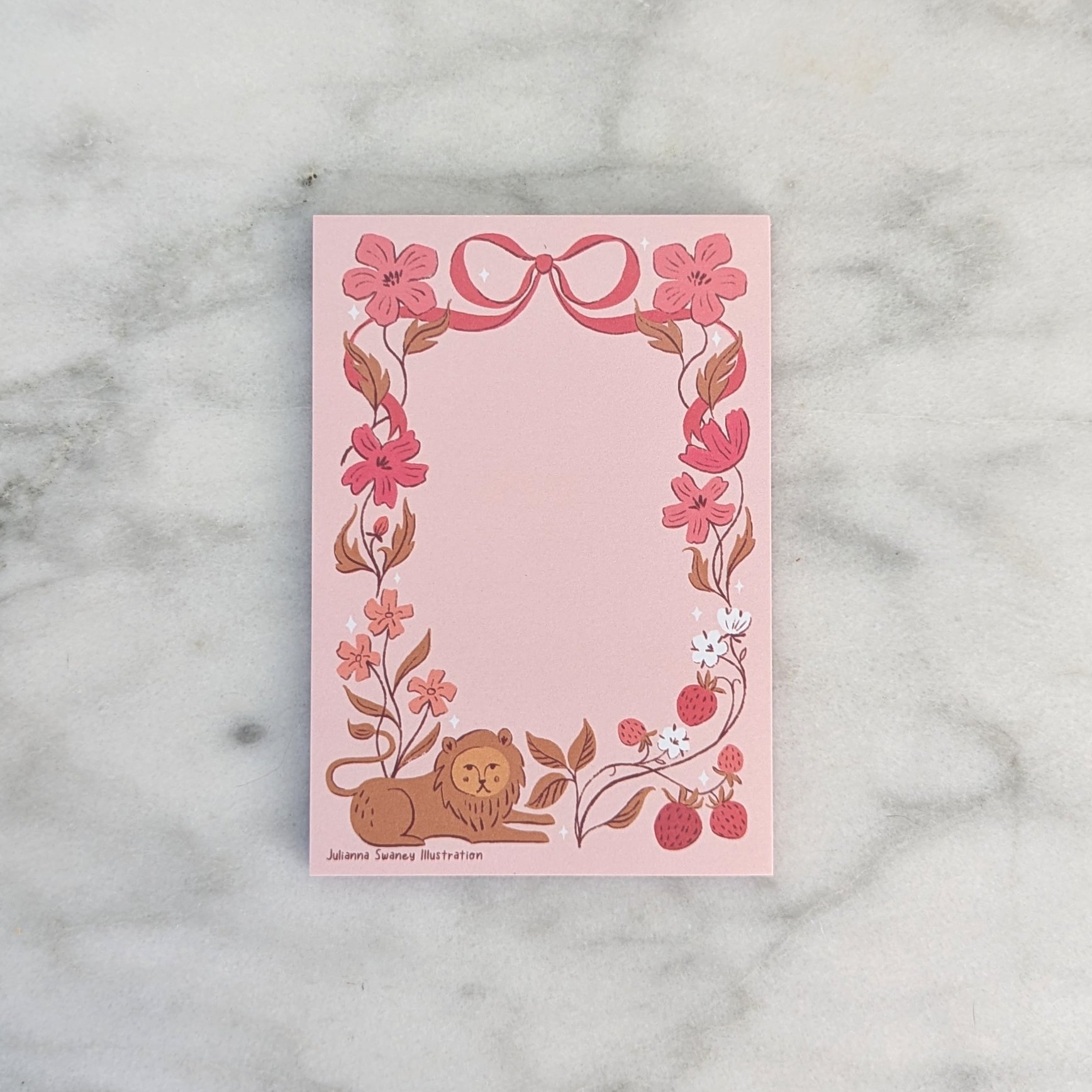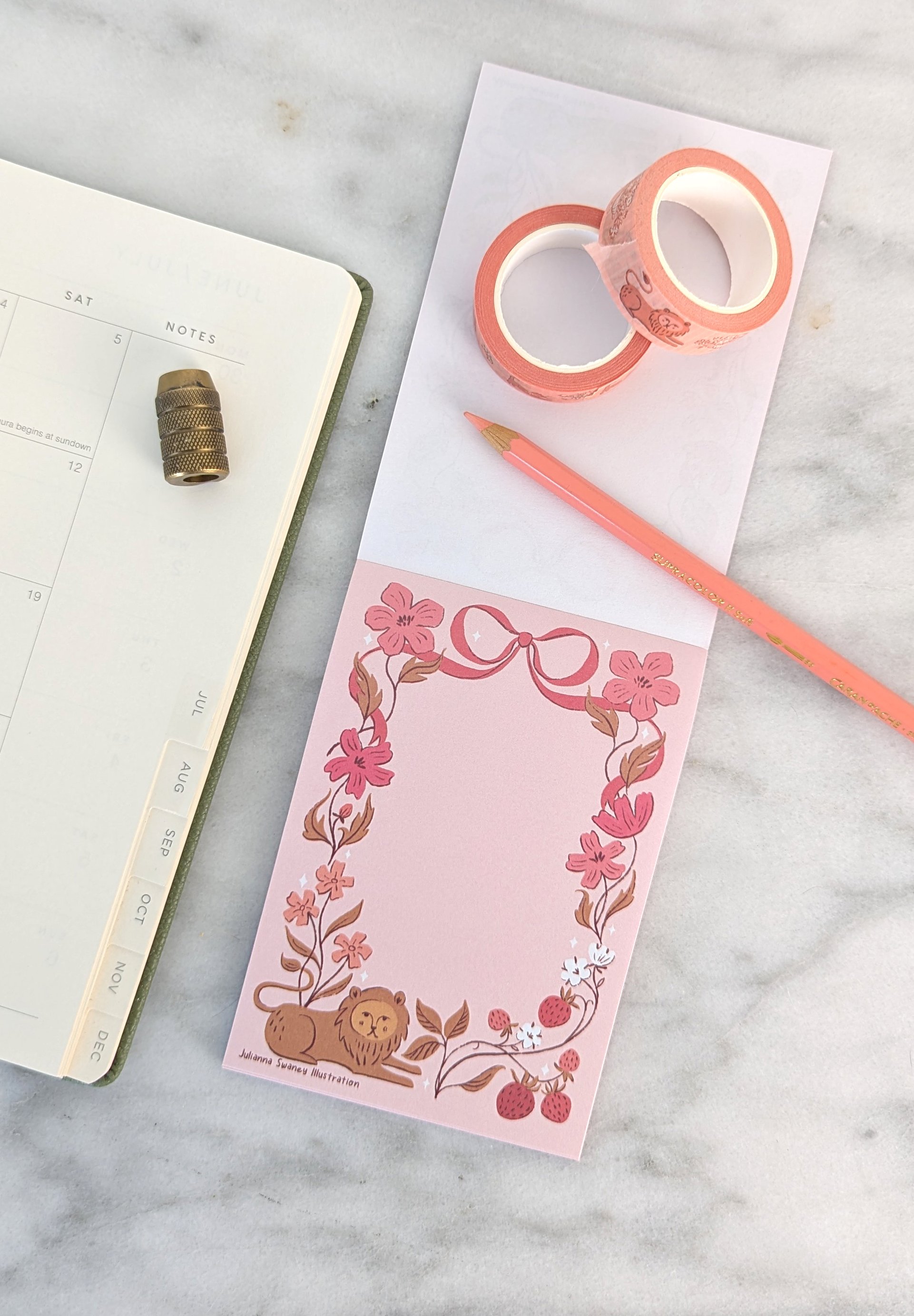 This charming tear away notepad features a design of whimsical flowers and strawberries, a sweet bow and lion all colored in pink, gold, and red shades