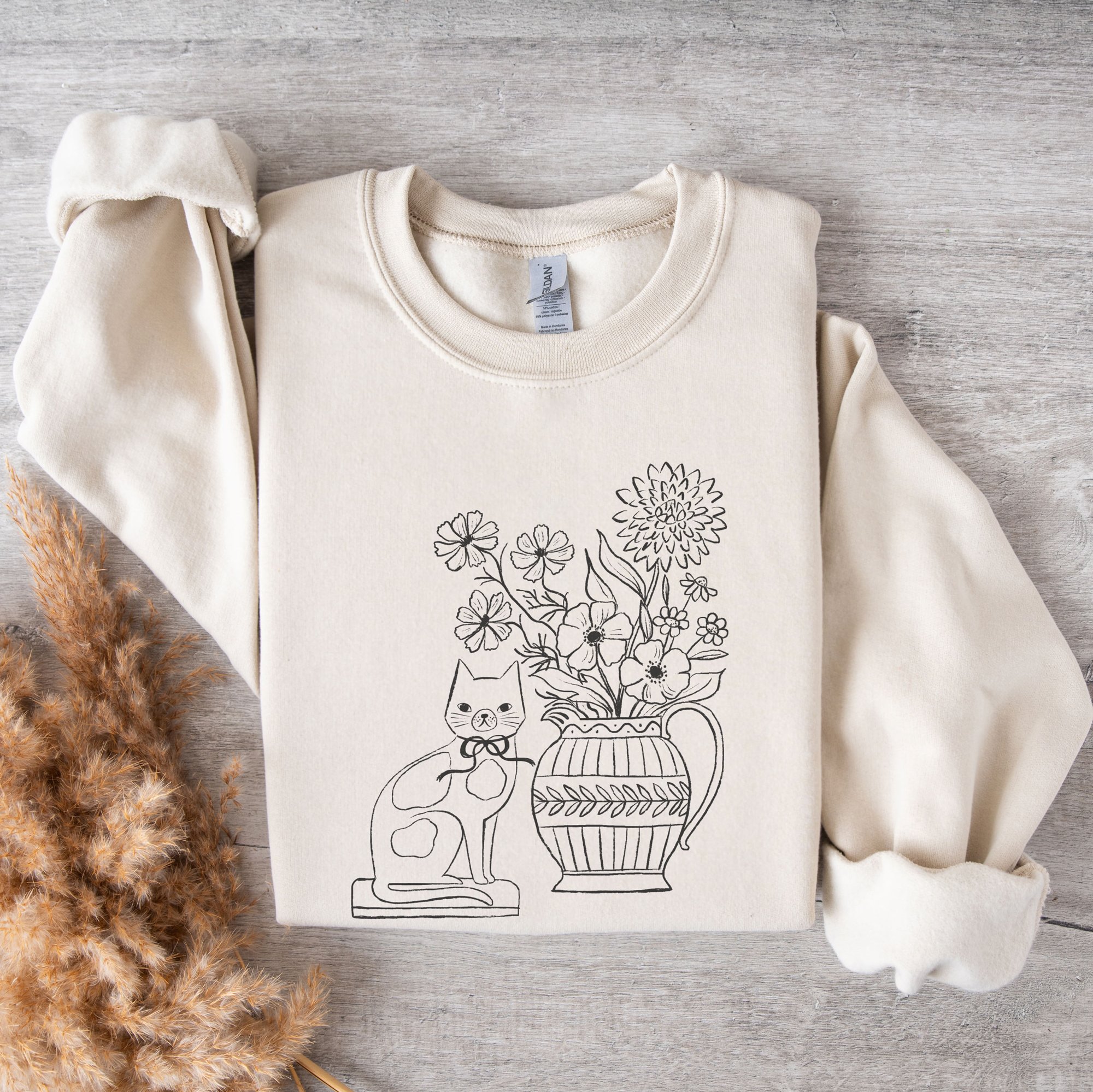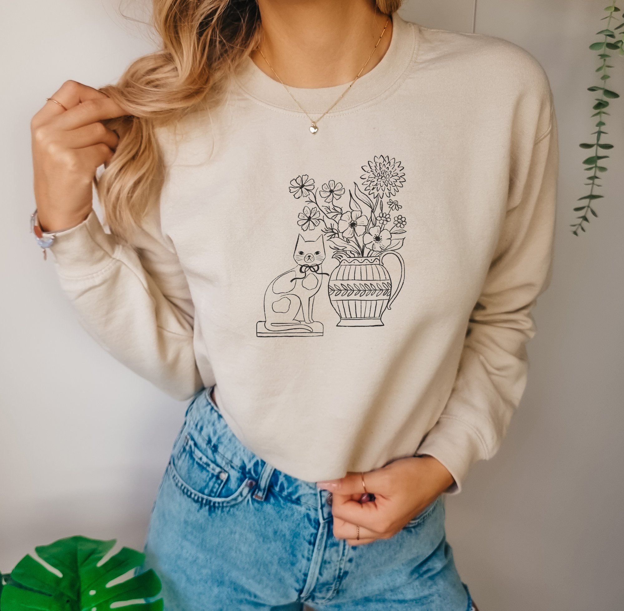 This minimal and dainty design is inspired by my love of Stafforshire figurines. It features my original line illustration of a Stafforshire cat figurine and vase of flowers on super soft and cosy sweatshirt.