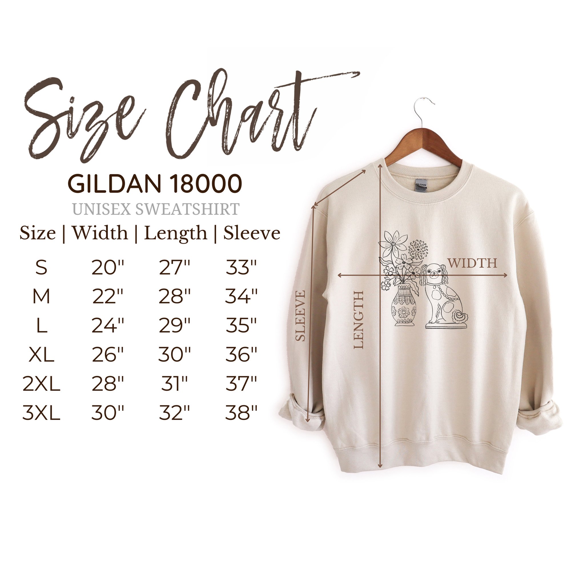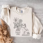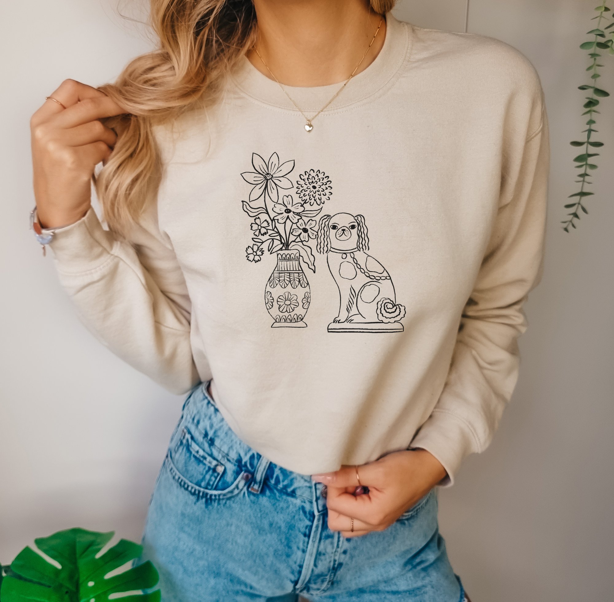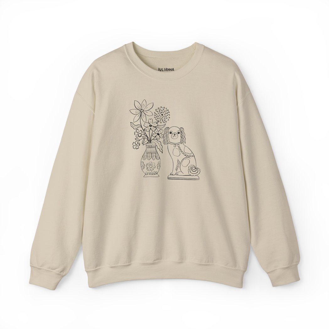 This minimal and dainty design is inspired by my love of Stafforshire figurines. It features my original line illustration of a Stafforshire wally dog figurine and vase of flowers on super soft and cosy sweatshirt.
