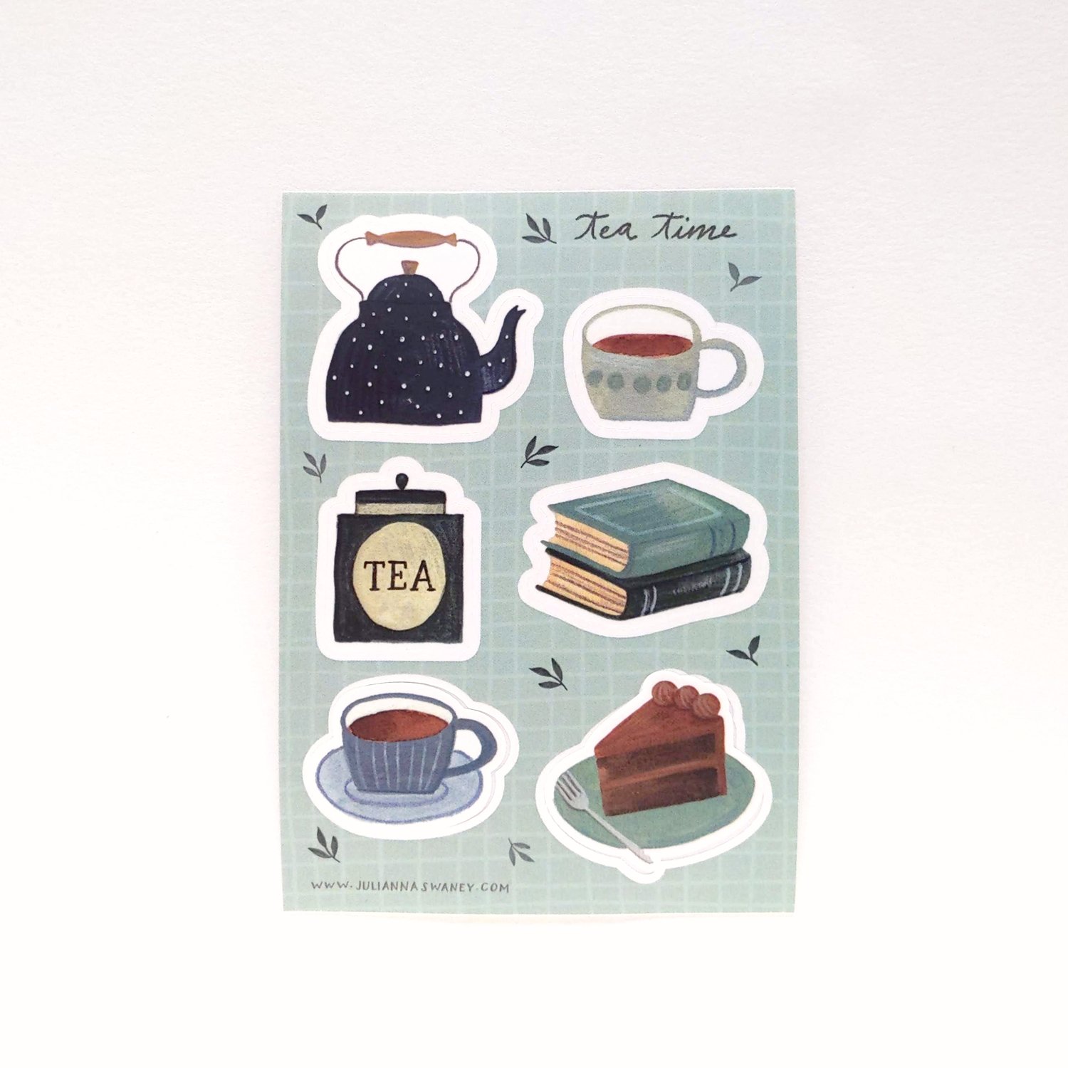 ◆ This cute little sticker sheet includes my illustrations of a blue speckled teapot, cups of tea, a tin of tea, books, and cake. Everything a tea lover needs for a cozy time!