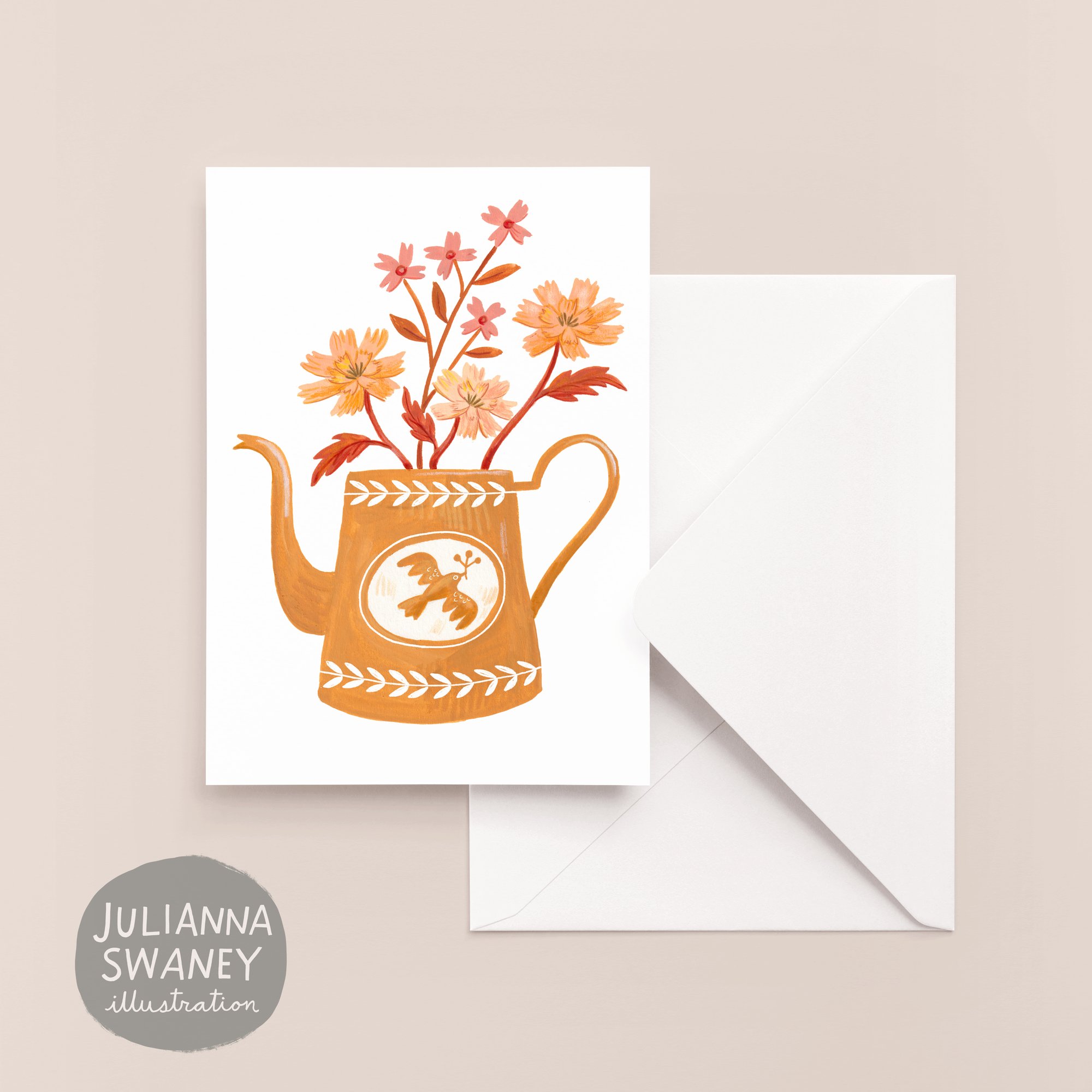 ◆ Brighten someone's day with this greeting card featuring my illustration of flowers in a cheerful yellow tea pot. ◆ Blank inside ◆5x7 inches ◆ Included one white envelope ◆ Packaged in a plant based compostable sleeve